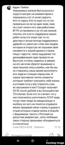 Пока Владимир угрожает Радмиле расправой, депутат Таибов призывает "спецслужбы" обратить внимание на антивоенные публикации горожан. В одном из своих комментариев Таибов написал, что "денацификацию", которой российские власти изначально объясняли военное вторжение в Украину, нужно провести и в Вуктыле.
